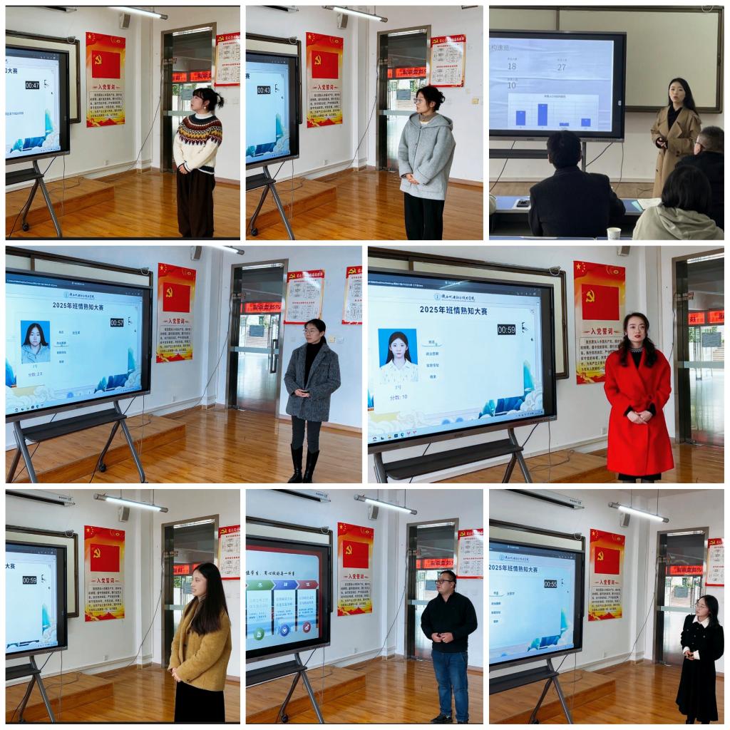 为进一步夯实班主任队伍建设,提升班级管理精细化水平,切实落实“以生为本”的教育理念,2025年11月10日下午,数字经管学院在电子信息大楼2207会议室隆重举办数字经管学院2025年班情熟知大赛。本次大赛由学院学工办主办,团总支学生会协办,全体参赛班主任及评委老师参与,学工办干事袁甜主持。