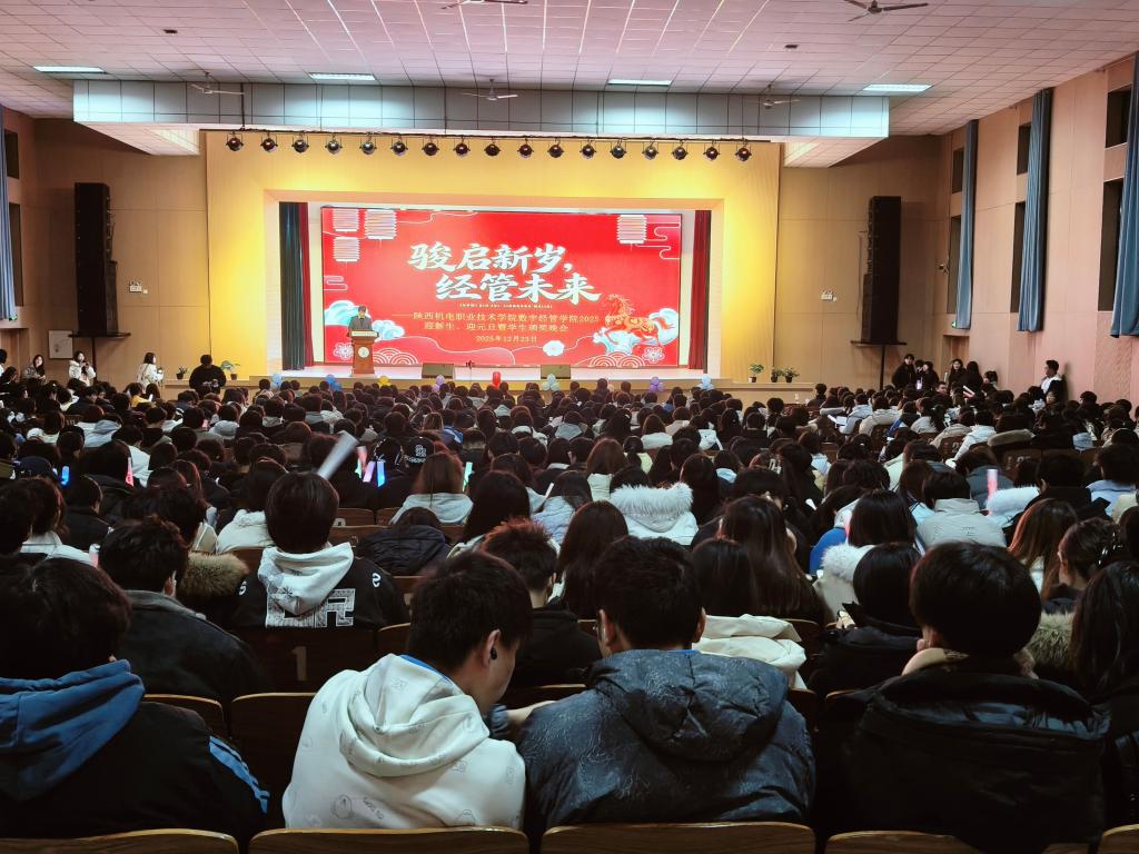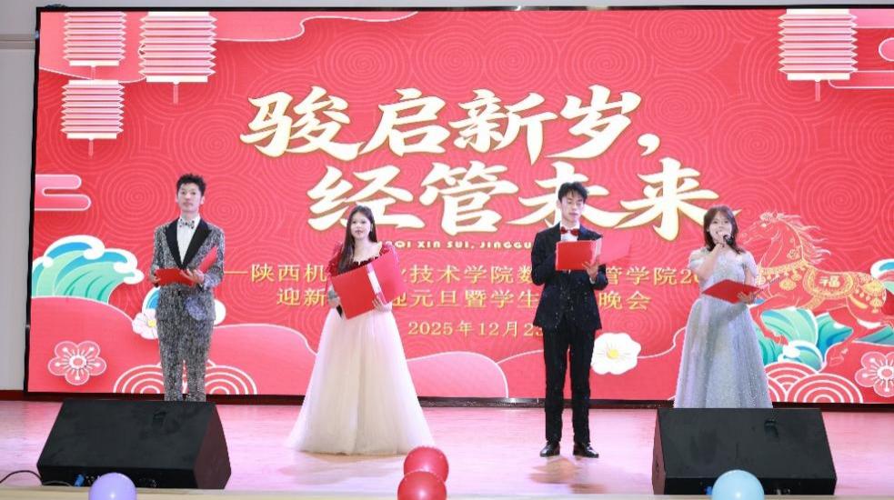 辞旧迎新启新程,青春逐梦谱华章。为迎接2025级新生加入、欢庆元旦佳节,并表彰先进典型,2025年12月23日,数字经管学院“骏启新岁 经管未来”2025迎新生、迎元旦暨学生颁奖晚会在宝福路校区大礼堂隆重举行。学院党支部书记孟发军、院长杜海军、副院长刘娟及全体教职工,与2025级新生、在校生代表欢聚一堂,共赴这场青春盛宴。