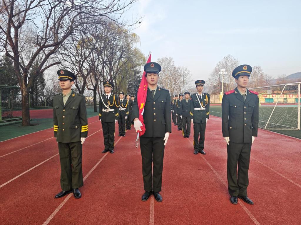 清晨的校园,阳光和煦,全体师生列队整齐、精神饱满,现场庄严肃穆。伴随着雄壮的《义勇军进行曲》,五星红旗冉冉升起,全体师生肃立致敬、齐声高唱国歌,目光坚定、神情庄重,尽显新时代青年学子的昂扬风貌与深厚爱国情怀。